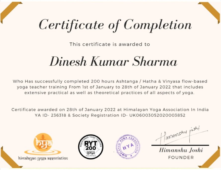 Yoga is the latest add on in Dinesh’s profile. He has completed his training at the Himalayan Yoga association, Rishikesh, India, and got certification from Yoga Alliance USA.